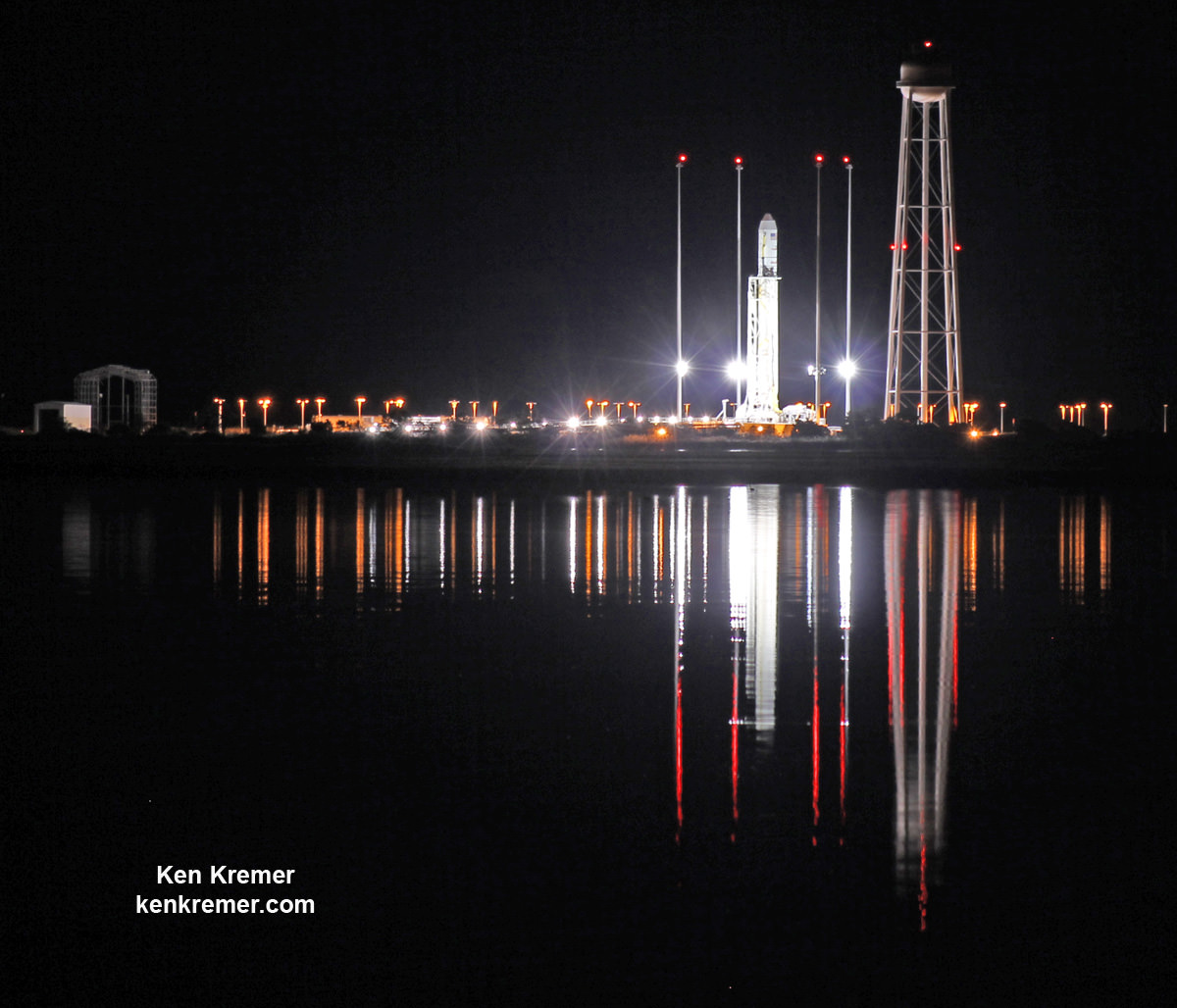 Antares rocket stands erect, reflecting off the calm waters the night before the first night launch from NASA's Wallops Flight Facility, VA, on Oct. 28, 2014. Credit: Ken Kremer/kenkremer.com[/caption]