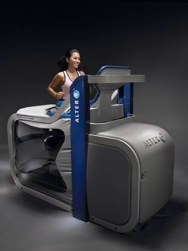 The Alter-G treadmill creates a seal around the user's waist and then inflates to create a pressurized environment that can take away up to 80% of the user's body weight, lessening the pounding to the joints. The technology was first proposed for use on the space station to actually increase the amount of gravity felt by the body by using differential air pressure in space to mimic the Earth's gravity to prevent bone loss and muscle deterioration.