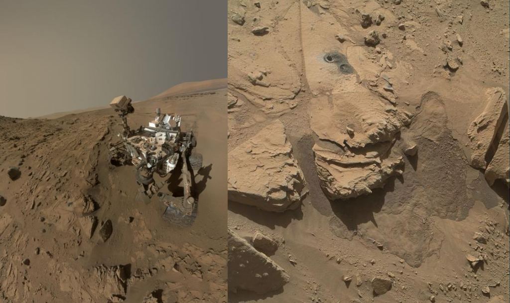 Other features include rover tracks and rover drilling and sampling sites.