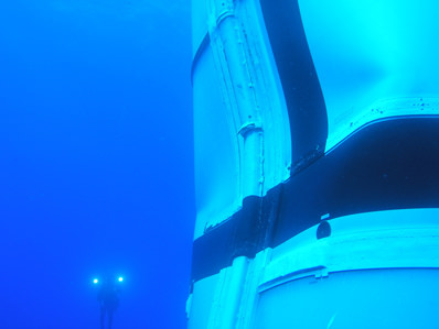 The booster rocket used in the Ares I-X test flight was found to be badly dented when divers located it in the Atlantic Ocean. The damage could have occurred as the booster hit the water.