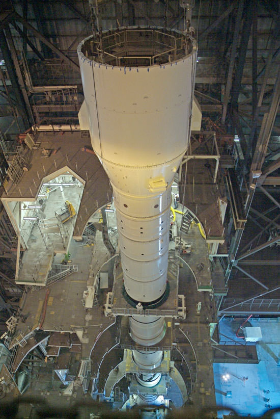 [/caption] Over the next month, four more super stacks with the final pieces of hardware (including the simulated crew module and launch abort system) will be mated, finishing off the stacking operations for the rocket.