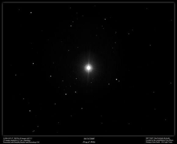 Now have a look at Beta Arietis - aka. Sheratan. Beta shines at magnitude 2.7 and is located 60 light years from Earth. Back at the turn of the 20th century it was discovered to be a spectroscopic binary, with a period of 106 days. According to Jim Kaler's fine research,"Sheratan stands out as a result of the extremely high eccentricity of the orbit (0.88), the companion trapped in a record-holding elongated path."