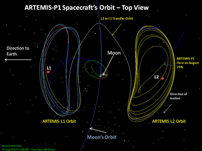 Next step: make the jump from Earth orbit to the tricky kidney-shaped "Lissajous" orbit, circling what's known as a Lagrangian point on each side of the moon. These points are the places where the forces of gravity between Earth and the moon balance each other – the point does not actually offer a physical entity to circle around. ARTEMIS P1 made the leap – in a beautiful arc under and around the moon -- to the Lagrangian point on the far side of the moon on August 25, 2010. The second craft made the jump to the near side of the moon on October 22. This transfer required a complex series of maneuvers including lunar gravity assists, Earth gravity assists, and deep space maneuvers. The combination of these maneuvers was needed not only to arrive at the correct spot near the moon but also at the correct time and speed.