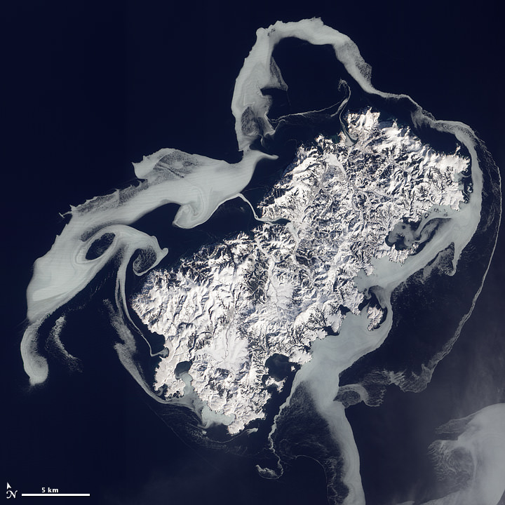 Looking rather otherworldly, this haunting view of Shikotan-to island shows ghostly swirls of sea ice surrounding the snow-covered volcanic island. Also known as Ostrov Shikotan, this island is at the southern end of a volcanic archipelago called the Kuril Chain, which is part of the Pacific Ring of Fire. The chain stretches approximately 1,300 km (810 mi) northeast from Japan, off the coast of Russia. The Advanced Land Imager (ALI) on NASA's Earth Observing-1 (EO-1) satellite captured this natural-color image of Shikotan on February 14, 2011.