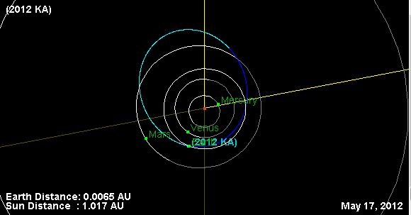 On the heels of a bus-sized asteroid that passed harmlessly between Earth and the orbit of the Moon on May 13, another asteroid between 4.5 and 10 meters (14-33 feet) wide will buzz by at about the same distance on May 17, 2012. Asteroid 2012 KA was discovered just today (May 16), and is projected to make its closest approach about 0.0015 AU, or 224,397 kilometers (134,933 miles, .6 lunar distances) from Earth's surface at 19:43 UTC on Thursday. The asteroid was discovered by the Mt. Lemmon Observatory, and at the time of this writing, is the only observatory that has made any observations. Therefore JPL lists the uncertainty of the orbit as fairly high (9 out of a 1 to 10 scale) but orbital projections from
