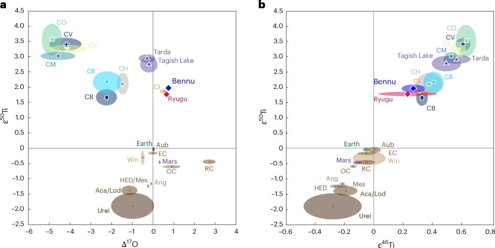 *These panels show the bulk titanium and oxygen isotopic compositions of Bennu samples in relation to other astromaterials. Panel a plots epsilon 50-titanium against oxygen isotopic composition. This comparison is important because both titanium and oxygen isotopes are used to trace the formation regions and processes in the early Solar System. Panel b shows the relationship between two titanium isotope signatures - bulk epsilon 50-Ti versus epsilon 46-Ti. This plot helps distinguish between different nucleosynthetic sources and processes that affected the titanium isotope composition. The symbols at the center of ovals represent the centre of the range of values. The sizes of the ovals represent the range of data for each material. Image Credit: Barnes et al. 2025. NatAstr*