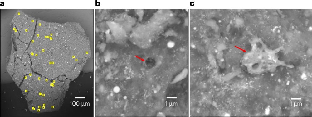 *These panels are scanning electron microscope images of one of the Bennu samples. a shows microcraters in yellow, b shows a typical microcrater, and c shows an impact melt deposit. Image Credit: Keller et al. 2025. NatGeo*