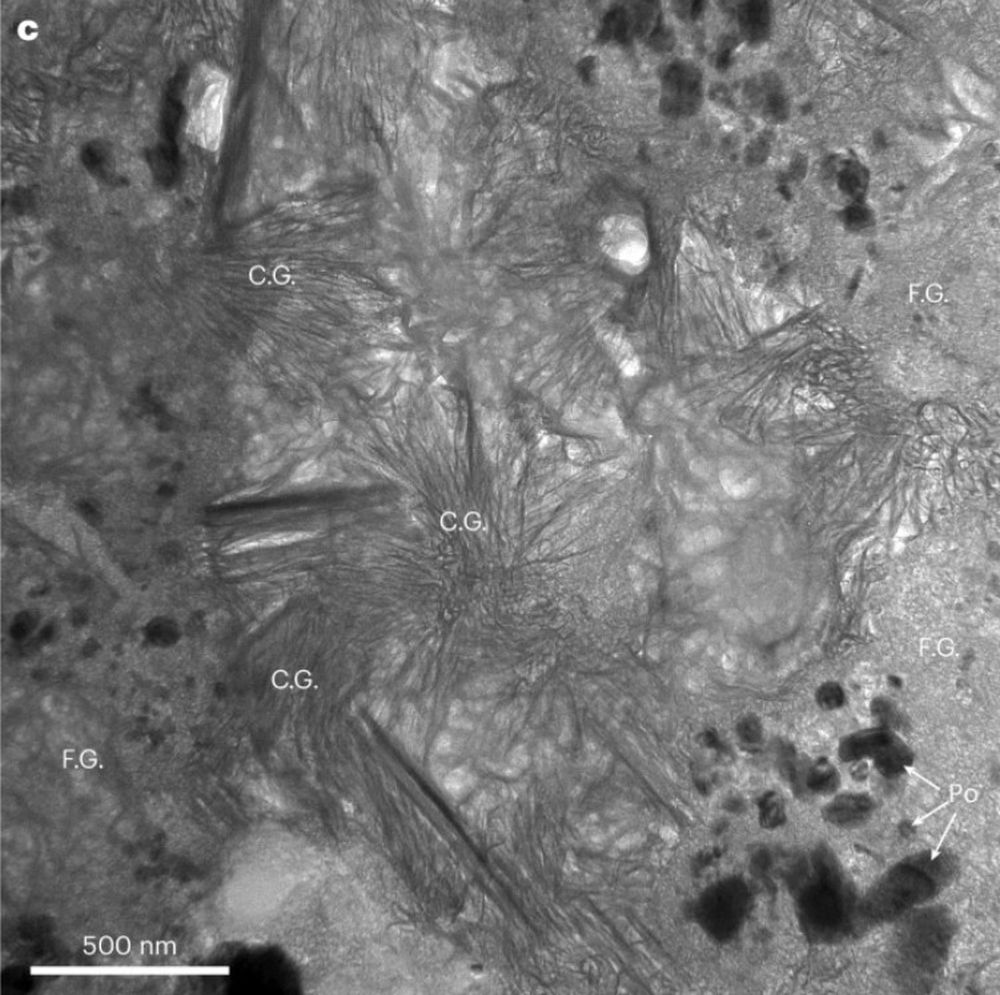 *This is an electron microscope image of a Bennu sample. It shows both coarse-grained (CG) and fine-grained (FG) hydrated sheet silicates that formed in the presence of water. The water came from ice in Bennu that was melted by remnant heat or heat from collisions. Image Credit: Zega et al. 2025. NatGeo*