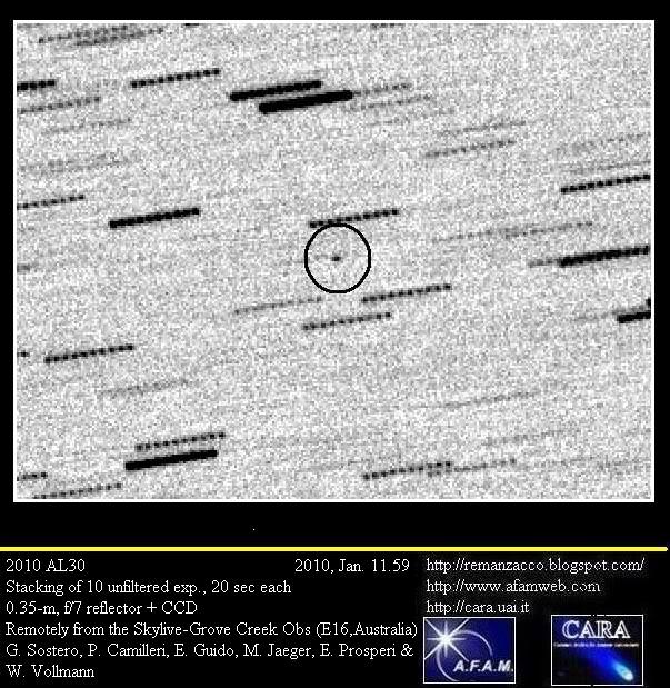 Caption: Asteroid or rocket booster? 2010 AL30 as imaged remotely from Australia on Jan. 11, 2010. Credit: Ernesto Guido & Giovanni Sostero, Remanzacco Observatory.