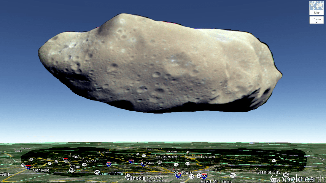 For example, I regularly drive through the St. Louis, Missouri metro area, so I have a sense of how big it is. Above, Villa places Asteroid 243 Ida -- which has an average diameter of 31.4 km (19.5 miles) -- to hover right above St. Louis. 31 km is about the distance from East St. Louis, Illinois to Creve Coeur, Missouri, which are the generally accepted eastern and western borders of the St. Louis metro area. I could probably drive across Ida in about 30 minutes -- if it's not rush hour, that is!