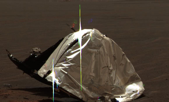 [/caption] This week's Astro Art of the Week is one of my favorite creations from my pal Stuart Atkinson, and it is a picture that never happened. Oh, the Opportunity rover did take a picture of its crumpled backshell on the surface of Mars, as seen above. But look closer: Stuart has added a reflection of the rover in the shiny metal -- a self-portrait that could have been taken had the rover come close enough. Stuart writes on his blog