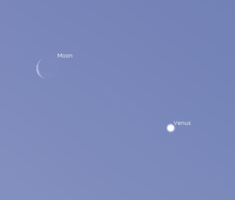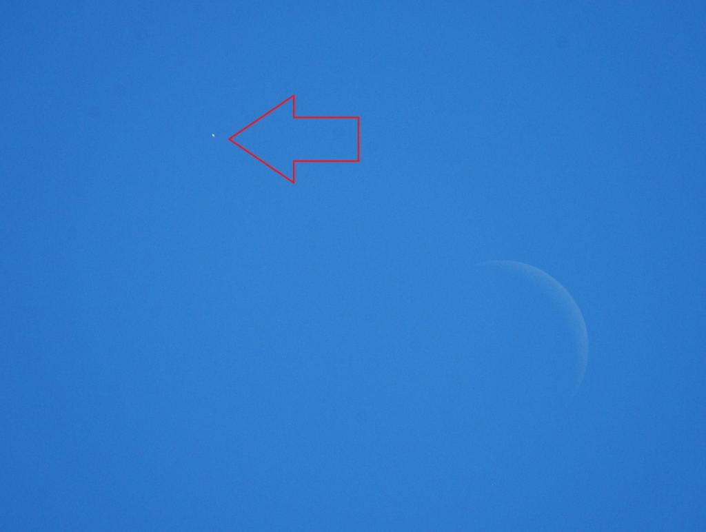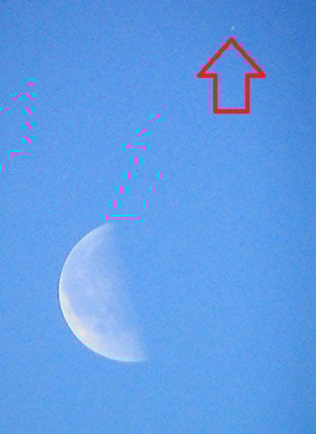 So, what can you see? First up and easiest to spy is the brilliant -4thmagnitude world Venus. A nearby crescent Moon can provide a good focusing point for your eyes against the featureless blue sky. Blocking out the Sun (A MUST if you are sweeping the sky with binocs!) behind an obstruction such as a hill or building is paramount. Once you get a glimpse of Venus in the daytime, you'll be amazed at how simple this feat is. I watched the Moon occult Venus in the daytime from our camp on the shores of Saint Froid Lake in northern Maine in 2007, and I also actually managed to catch Venus pass through inferior conjunction while observing from Alaska in 1998! This is possible because the orbit of Venus is tilted 3.4° degrees relative to the ecliptic. When maximum tilt occurs near inferior conjunction, the razor thin crescent of Venus is just visible 3 degrees above the horizon at sunrise.