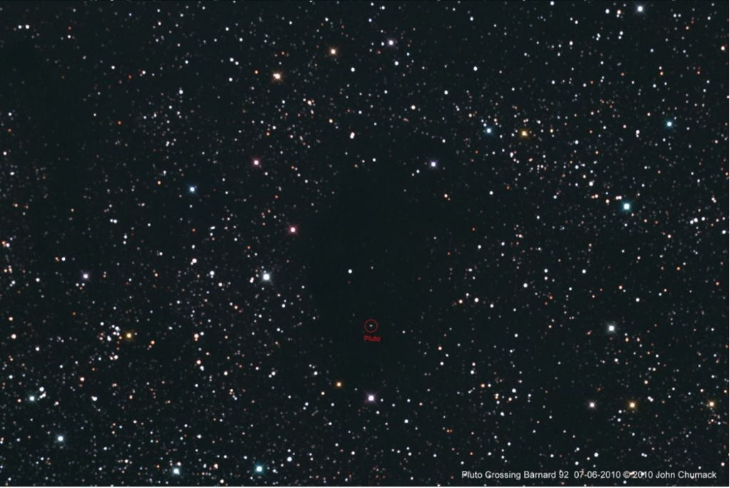 At the eyepiece, Pluto presents a +14thmagnitude dot. You'll have to star hop through the dense star field to locate the distant world. Sketching or photographing the region to cinch the sighting. Your watching for the slight but discernible motion of the world from one night to the next. Heavens-Above can give you the right ascension/declination search coordinates for Pluto for a given night.