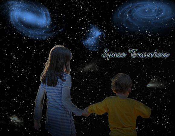 , along with a photo of her daughter and nephew. "I've gotten a lot of positive comments about it," she said. "I was new to Photoshop then, but I've been having fun learning new things. I probably would have done some things differently now, but all in all I think it turned out pretty neat. It was an experiment because I was fascinated by the idea of Photoshop's "brushes," so that's where the stars/galaxies/etc. came from. I didn't have any particular picture or project in mind when I made it...it just sort of came together after several hours of fooling around with stuff."