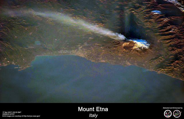 A nighttime view from orbit of Mount Etna, erupting on March 19, 2017, taken by ESA astronaut Thomas Pesquet. The red streaks on the lower left are molten lava. See detail below. Credit: NASA/ESA. [/caption]
