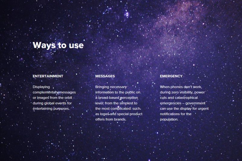 Another use is as entertainment, though that idea doesn't seem too well thought out. The StartRocket website says, "ENTERTAINMENT: Displaying complementary messages or images from the orbit during global events for entertaining purposes."