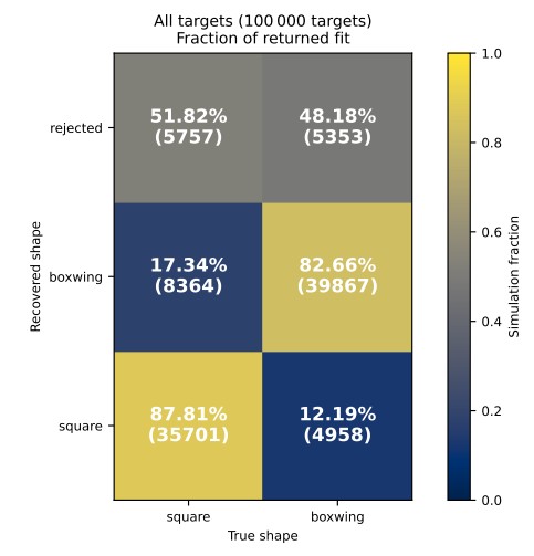 The researchers simulated 100,000 satellites in their work. When the data isn't strong enough to make a determination, the satellites are designated as either correct, incorrect, or rejected. Square satellites have a slightly worse success rate than boxwings and are also more likely to be rejected. This is probably because they have smaller surface areas. That means fewer intersection points and less robust fits.
