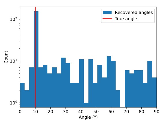 This figure shows the recovered angles for a simulated satellite. "The true rotation value is marked in red and is well recovered as the modal peak in the distribution," the authors write. Image Credit: Cooke et al. 2025, RASTI.