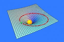 Massive objects like the Sun and even the planets warp the fabric of space. Here a planet orbits the Sun but doesn't fall in because of its sideways orbital motion.[/caption]