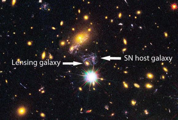 Detailed color images taken by the GLASS and Hubble Frontier Fields groups show the supernova's host galaxy is also multiply-imaged by the galaxy cluster's gravity. According to their