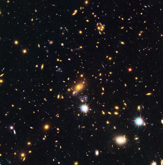 Turns out there are lots of these gravitational lenses out there in the form of massive clusters of galaxies. They contain regular matter as well as vast quantities of the still-mysterious dark matter that makes up 96% of the material stuff in the universe. Rich galaxy clusters act like telescopes - their enormous mass and powerful gravity magnify and intensify the light of galaxies billions of light years beyond, making visible what would otherwise never be seen.