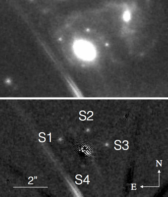 Let's return to SN Refsdal, named for Sjur Refsdal, a Norwegian astrophysicist who did early work in the field of gravitational lensing. A massive elliptical galaxy in the MACS J1149 cluster "lenses" the 9.4 billion light year distant supernova and its host spiral galaxy from background obscurity into the limelight. The elliptical's powerful gravity's having done a fine job of distorting spacetime to bring the supernova into view also distorts the shape of the host galaxy and splits the supernova into four separate, similarly bright images. To create such neat symmetry, SN Refsdal must be precisely aligned behind the galaxy's center.