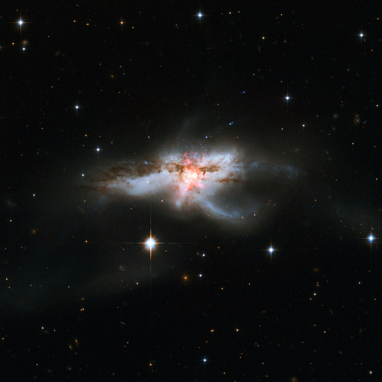 NGC 6240 is a puzzle to astronomers. For a long time, astronomers thought the galaxy is a result of a merger between two galaxies, and that merger is evident in the galaxy's form: It has an unsettled appearance, with two nuclei and extensions and loops.