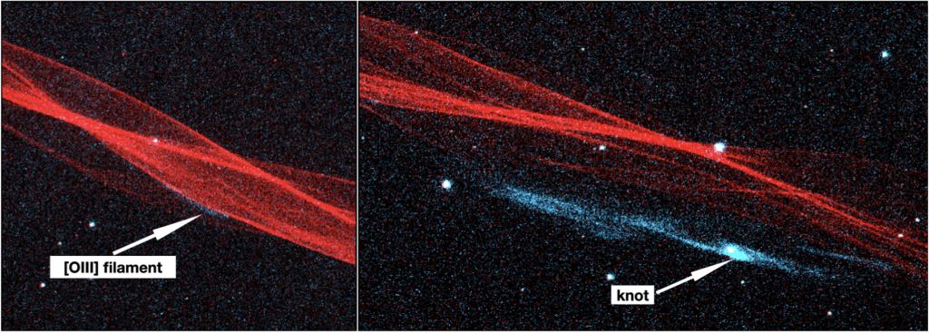The Cygnus Loop's overall shape is shell-like. But on the SNR's perimeter, there are notable places where the outgoing shock wave forms knots. These are shocks, and there are two types: radiative and non-radiative. Radiative ones radiate energy, and non-radiative ones don't. A third type, transitional shocks, is transitioning from non-radiative to radiative. Observing and mapping all three types in the study region sheds light on how SNRs behave as their shock waves travel through space and interact with other matter.