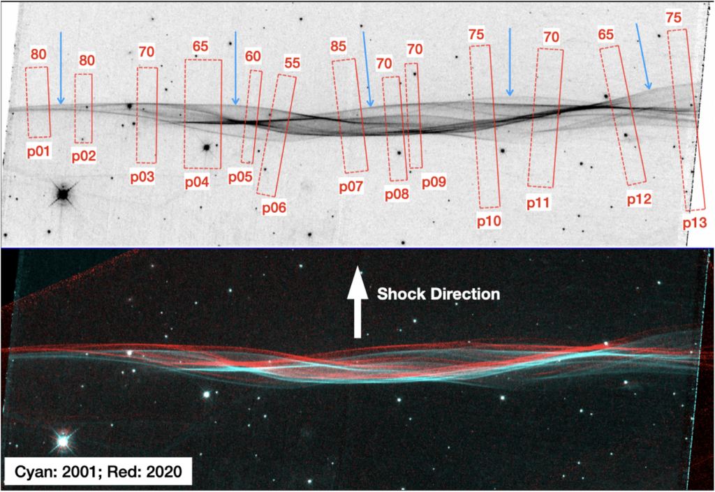 At the heart of the study is a Balmer-line filament, the thin wisp of gas that appears reddish-orange in the image. Balmer lines are spectral line emissions from hydrogen atoms. The lines indicate different energy states as electrons transition from one level to another due to ionization. The SNR's shock wave heats the otherwise invisible neutral hydrogen to a million degrees F as it passes through. This heating is followed by cooling, and the electrons in the hydrogen change state, releasing photons. The specific energy level of the photon makes it appear red to our eyes. The primary Balmer line is called H-alpha, and it's a visible deep-red spectral line that's conspicuous throughout the Universe. Many nebulae are red or partially red because of the H-alpha line, and it indicates ionized hydrogen.