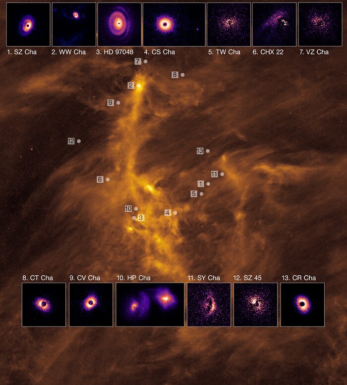 In total, the team observed 43 stars in the Taurus region, and found planet-forming disks around 39 of them; 20 stars in the Chamaeleon I region, detecting discs around 13; and 23 stars in the Orion region, with planet-forming discs around 10 of them.