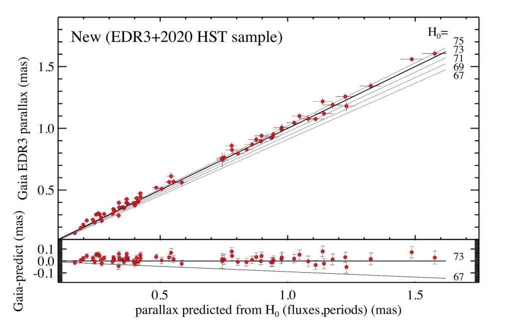 Reference: Riess, Adam G., et al. " Cosmic Distances Calibrated to 1% Precision with Gaia EDR3 Parallaxes and Hubble Space Telescope Photometry of 75 Milky Way Cepheids Confirm Tension with LambdaCDM." *arXiv preprint* arXiv:2012.08534 (2020).