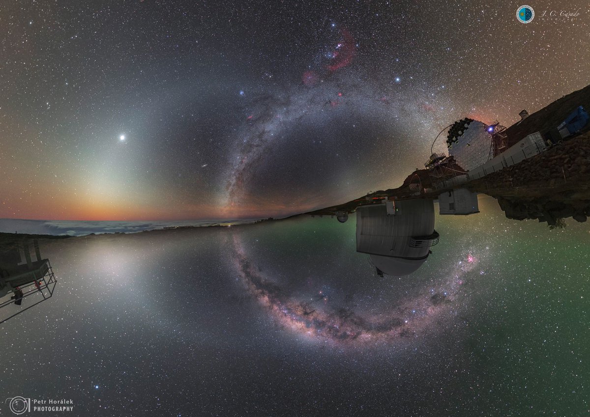 Image of the Roque de los Muchachos Observatory on the Canary Islands (upper part) and the La Silla Observatory in Chile in the lower part. The composition makes the Milky Way appear circular.