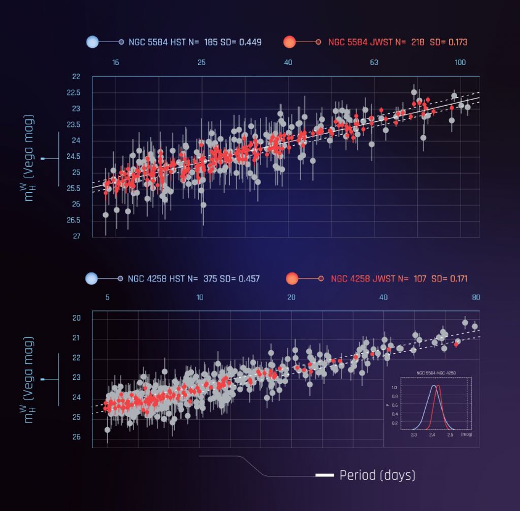 A few years ago Cepheid observations from Hubble were used to see if adjustments in the period-luminosity relation could account for the Hubble tension, but the results didn't look promising. Now a study using JWST observations has been released. One advantage of JWST over Hubble is that Webb observes Cepheids in infrared light, which penetrates interstellar dust more readily. The Webb observations are also better at addressing the issue of "crowding," where light from the Cepheid can be overwhelmed a bit by the light of stars in the same cluster. So these latest results are the most accurate Cepheid observations we have. In this new study, the team looked at more than a thousand Cepheid variables and was able to pinpoint the distance relation for Cepheids with extreme precision. From this, they proved that Cepheid variable error can't account for the Hubble tension.