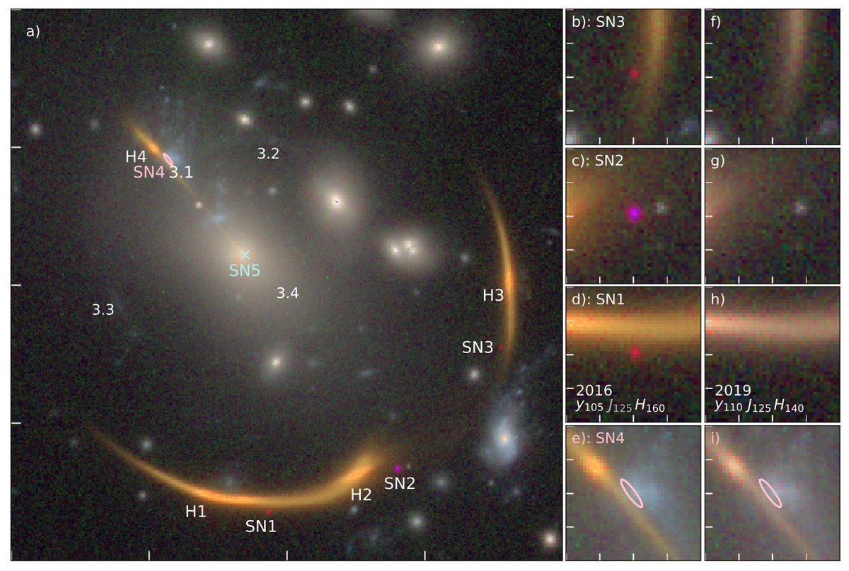 MRG-M0138 is "quadruply lensed" meaning that four copies of the galaxy can be seen dispersed around a galaxy cluster closer to our own galaxy, known as MAC J0138.02155. So when the team was surveying data in the region in July 2019, they noted the three point sources of light that were present in data from July 2016 were no longer there. Most likely the data in July 2016 captured a supernova lensed 3 different ways.