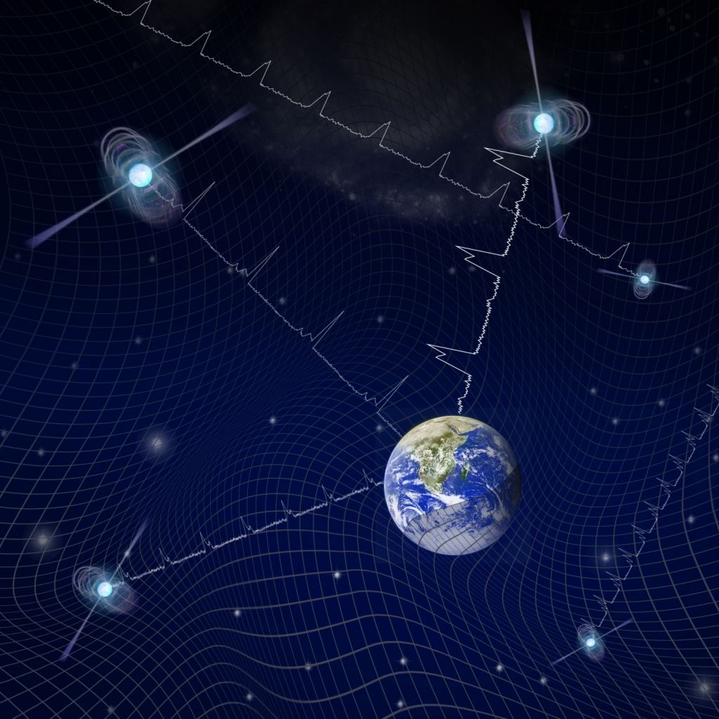 To detect these gravitational waves, NANOGrav observes radio pulses from rapidly rotating neutron stars known as millisecond pulsars. Most of these pulsars are very regular, so a shift change in their pulse rate is caused by a change in their motion relative to Earth. Essentially, NANOGrav is like LIGO but on the scale of our galaxy. But because these background gravitational waves oscillate so slowly, it takes years to observe a shift of the pulsars due to them.