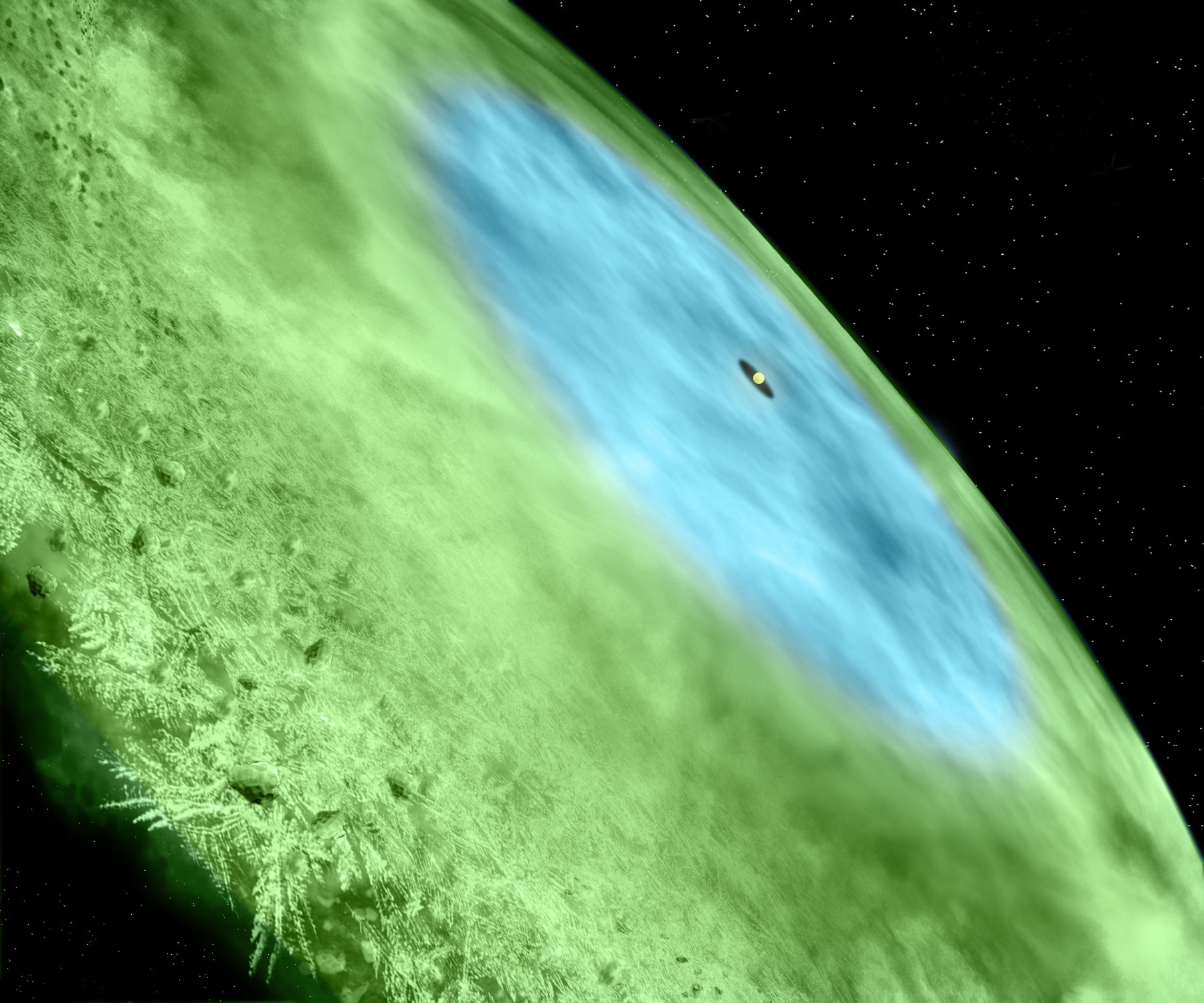 The real deal enhanced-color picture of TW Hydrae is below, courtesy of a newly completed telescope: the Atacama Large Millimeter/submillimeter Array in Chile. It is designed to look at grains and other debris around forming solar systems. This snow line is huge, stretching far beyond the equivalent orbit of Neptune in our own solar system. See the circle? That's Neptune's orbit. The green stuff is the snow line. Look just how far the green goes past the orbit.