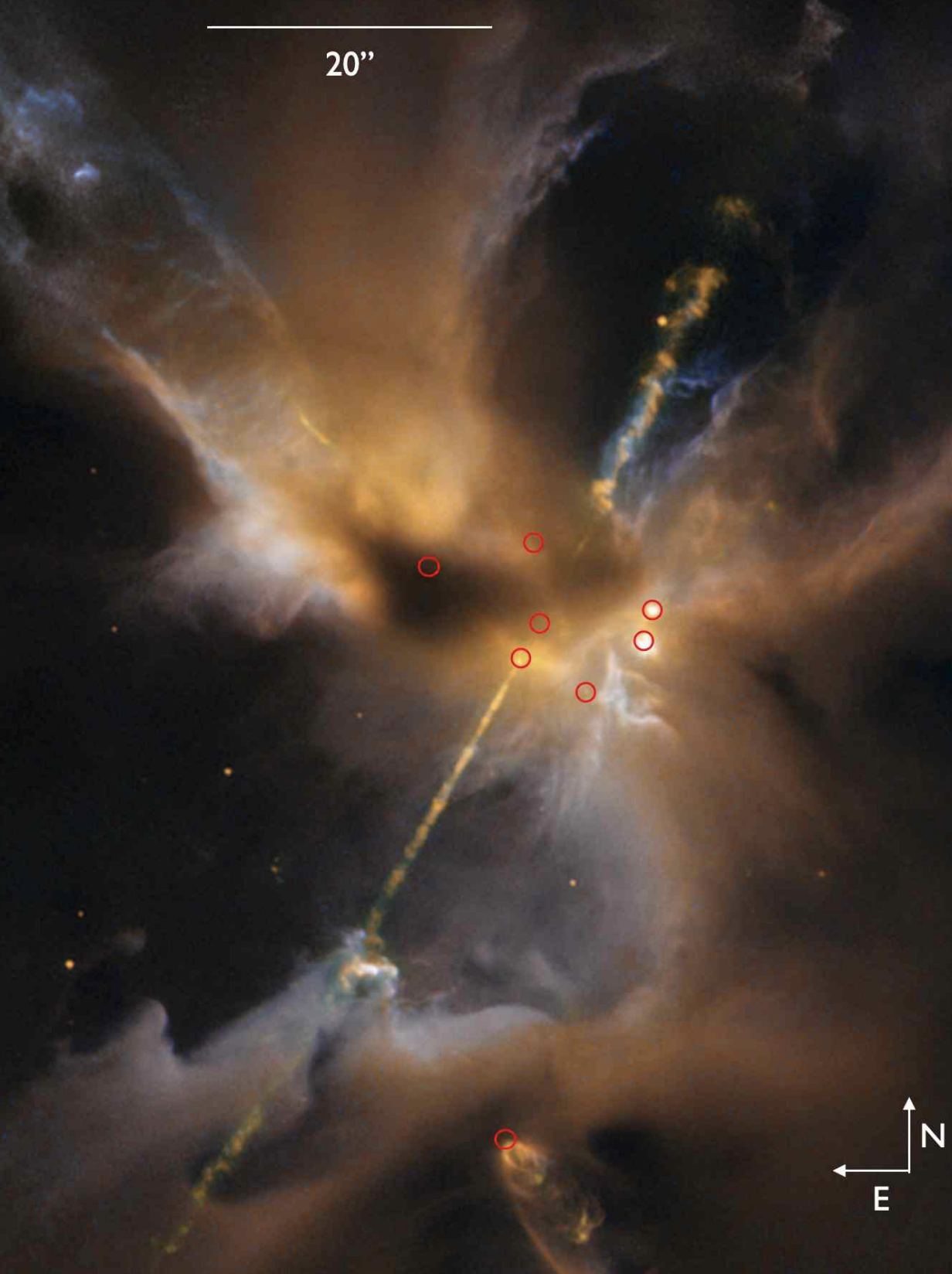 In the case of the HH 24 complex, the astronomers have observed five thin, narrow jets emanating from the central core. These jets are wrapped by magnetic field lines that give them their shape. All together the jets extend for at least five light years away from the core.