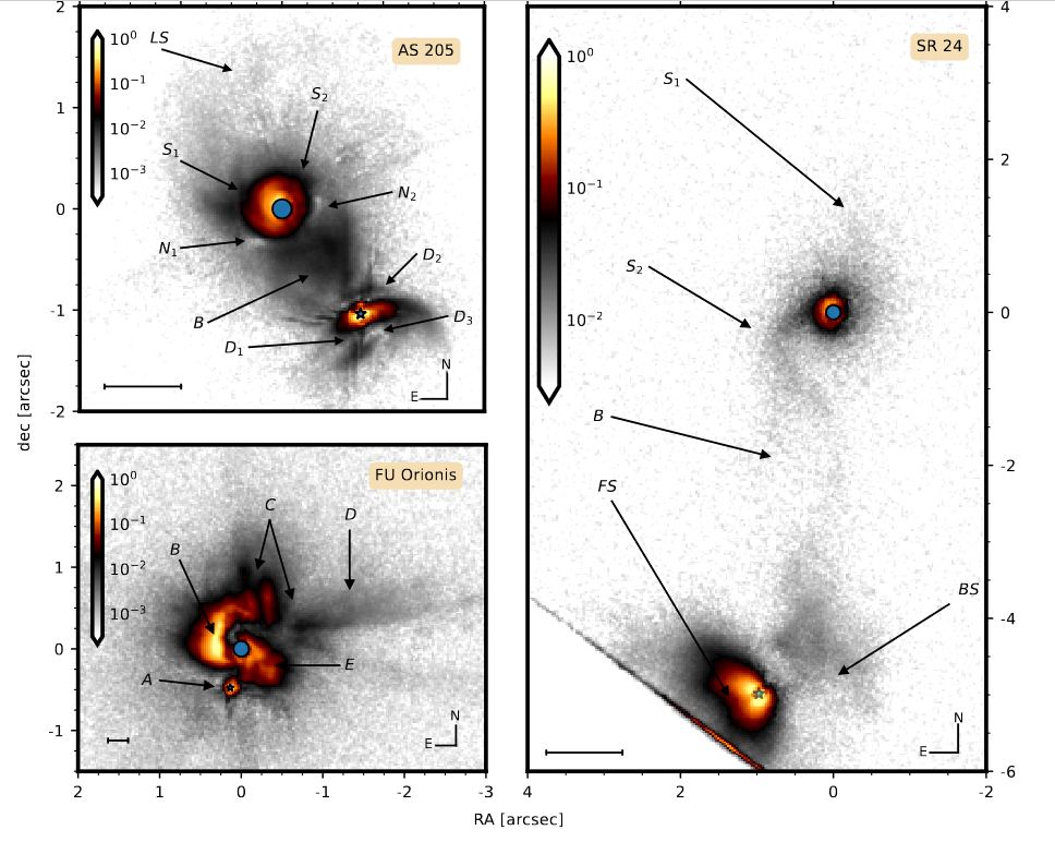 These include non-recurring, hyperbolic, or parabolic passages (aka. "fly-bys"), through the co-evolution of binary stars, or through one star capturing another (aka. binary capture). To test their predictions, the team analyzed three interacting twin-disc systems (AS 205, EM* SR 24, and FU Orionis) using the Infra-Red Dual Imaging and Spectrograph (IRDIS) on the VLT's SPHERE instrument. This cryogenic camera allows SPHERE to conduct dual polarized light observations of AS 205, EM* SR 24, and FU Orionis in the 0.95 - 2.32 ?m near-infrared (NIR) band.