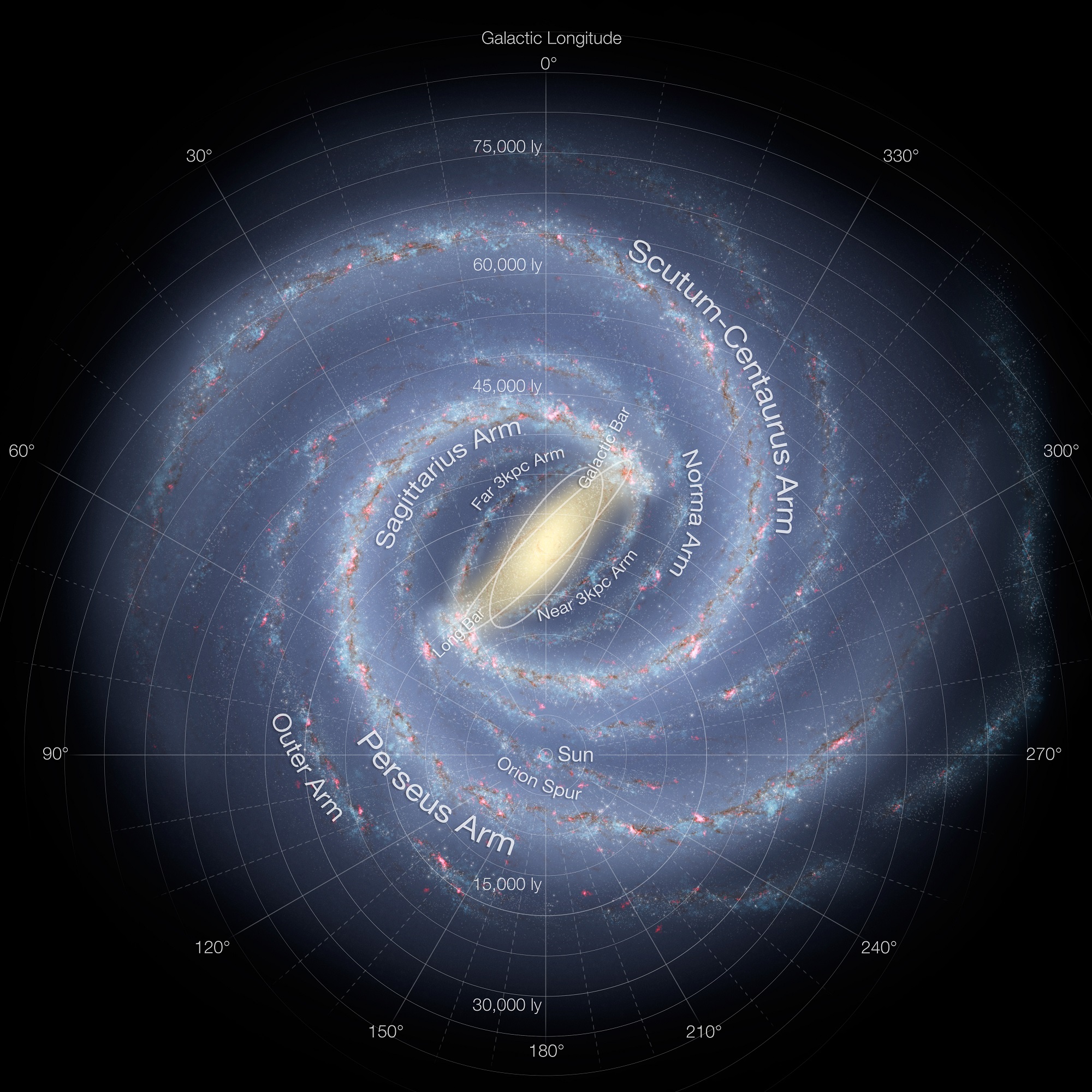 Artist's view of the Milky Way with the location of the Sun and the star forming region at the opposite side in the Scutum-Centaurus spiral arm. Credit: Bill Saxton, NRAO/AUI/NSF; Robert Hurt, NASA.
