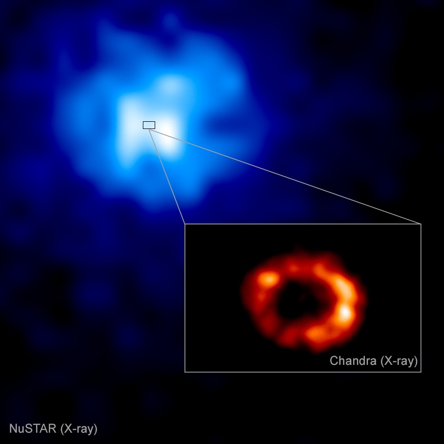With ALMA's promising radio signal results in hand, a team of researchers followed up by observing the supernova in X-Ray wavelengths, using data from two different NASA spacecraft: the Chandra X-Ray Observatory, and the Nuclear Spectroscopic Telescope Array (NuSTAR). Their results are being published in the Astrophysical Journal this month. What they've found is an X-Ray emission near the core of the supernova explosion, with two possible explanations.