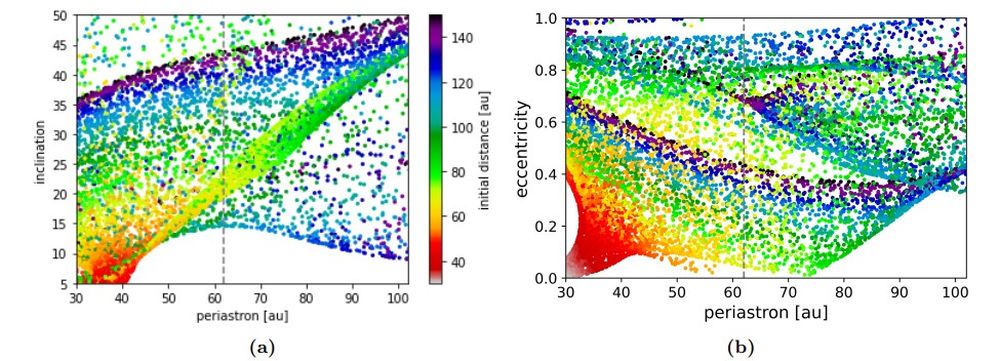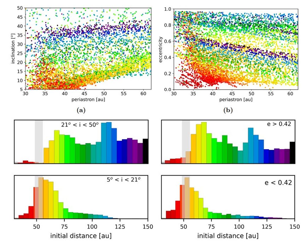When it comes to colours, the results were similar to previous research showing that colour and orbital inclination are correlated. The authors explain that "red test particles are mainly found at low inclinations and periastron distances, suggesting that they retain more of their original dynamics." On the other hand, green to blue particles dominate higher orbital inclinations, where red and orange particles are rare. The red test particles correspond to the very red TNOs, and the other colours represent the shades of grey observed for TNOs.