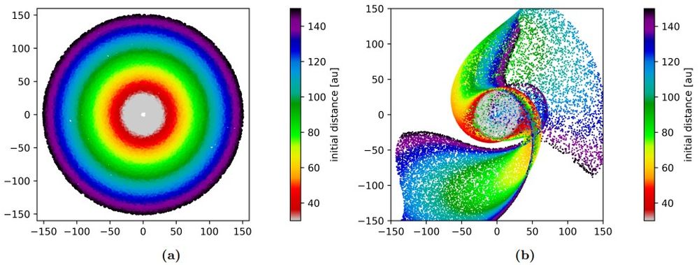 One of the things the simulation showed was that a stellar flyby shepherded the TNOs into a spiral arm shape. "The perturber significantly alters their orbits, creating visible spiral arms due to the induced sub- and super-Keplerian velocities," the researchers explain.