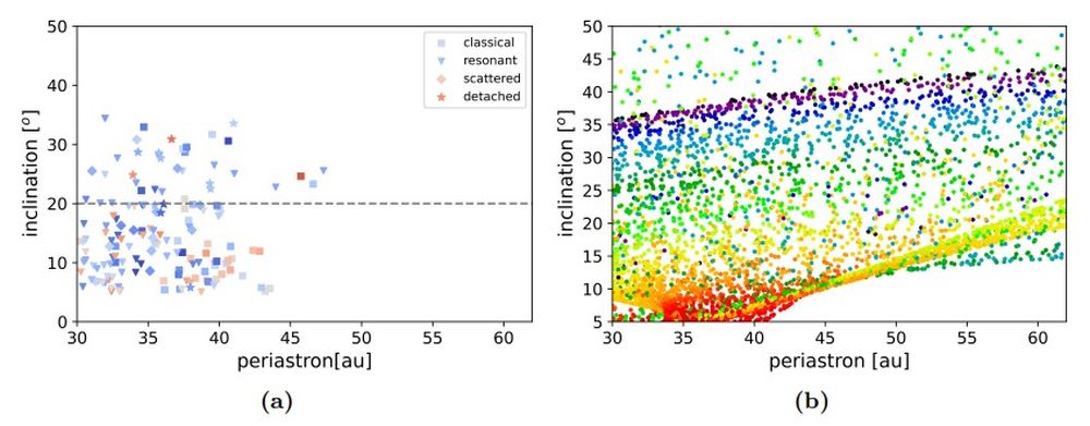 This figure shows scatter plots of the TNOs’ inclination as a function of periastron distance.(a) shows observational data from other research for TNO orbital inclinations by periastron distance. (b) shows the simulation results. Image Credit: Pfalzner et al. 2025. The Astrophysical Journal Letters.