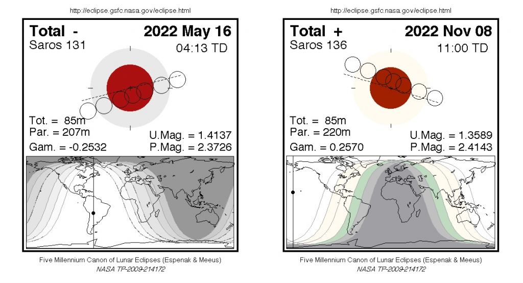 -November 8th: a total lunar eclipse (totality is also 1 hour and 25 minutes in duration) favoring Asia, Australia, the Pacific and the Americas.