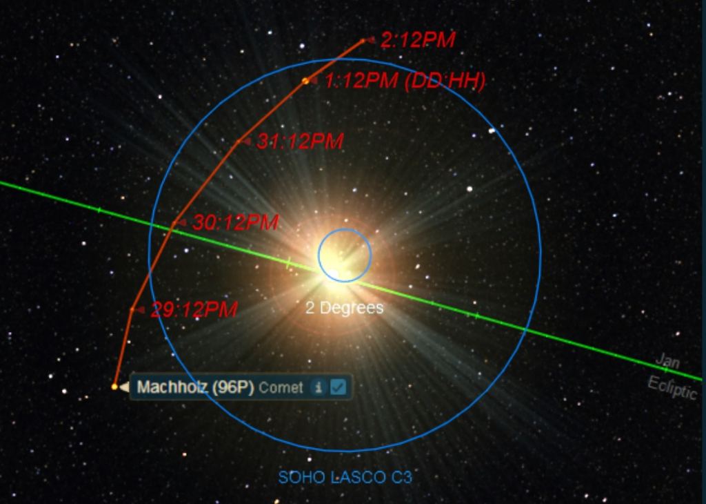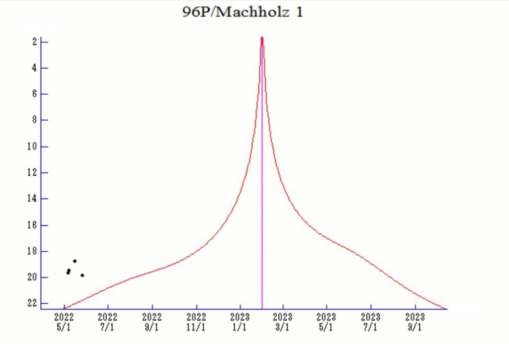 - 96P Machholz 1 may top out at +2ndmagnitude in February 2023. The comet reaches perihelion on January 31st. Unfortunately, the comet will also pass very close to the Sun at its brightest, and will be visible low to the dawn afterwards.