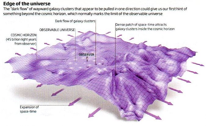 The aberrant bulk flow might result from the existence of a large concentration of mass beyond the edge of the observable universe – or heck, maybe it is another adjacent universe. Since the cause is unknown - and perhaps unknowable, if the cause is beyond our observable horizon – the astronomical