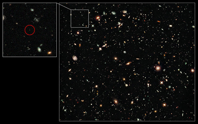 This distance works out to be about 30 billion light years. But we are just guessing that UDFy-38135539 is still there - more likely it has merged with other young galaxies - perhaps becoming part of a huge spiral galaxy similar to our own Milky Way, which itself contains stars that are over 13 billion years old.