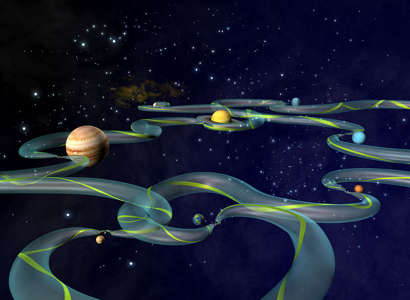 [caption id="attachment_58948" align="alignnone" width="580" caption="The image on the left (Credit: American Scientist) shows an ITN 'tube' approaching Earth's L2. At this point a cosmic hitchhiker can either double back on a trajectory towards Venus (red line), stay in orbit around L2 and tag along with Earth– or continue on through (blue line), perhaps entering another ITN tube on the way to Mars. The image on right shows a tongue-in-cheek depiction of the ITN tube network (Credit: NASA)."]