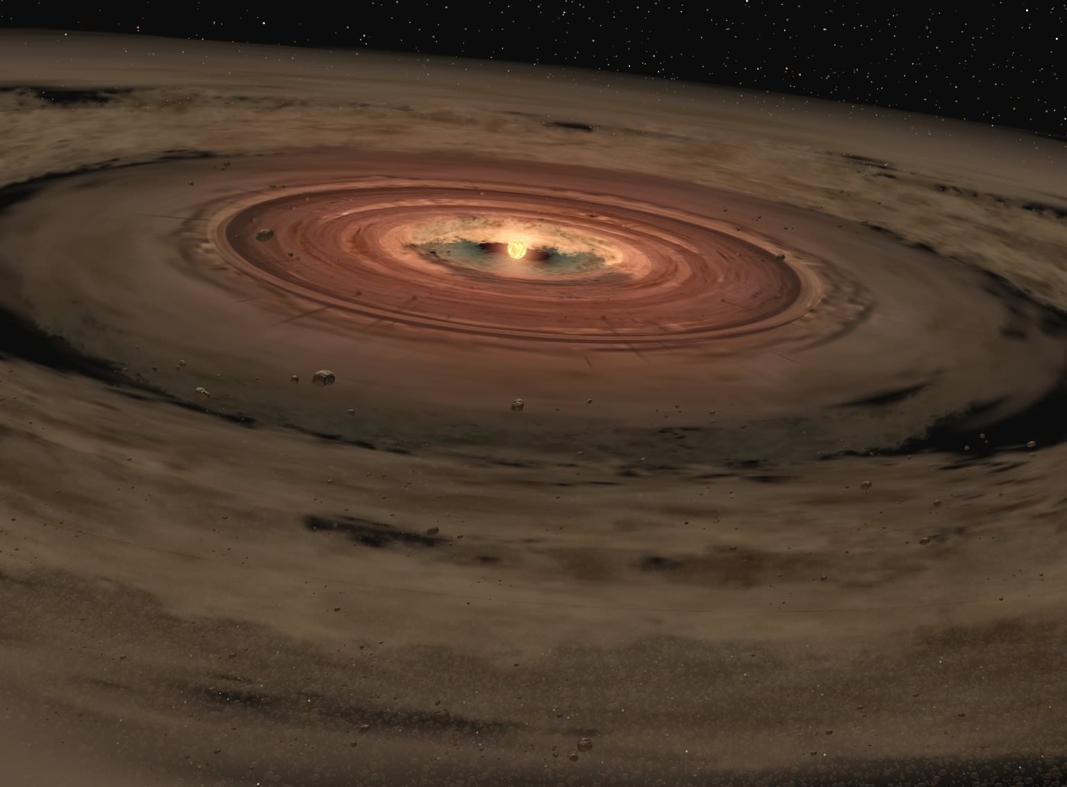 you have a rotating protoplanetary disk within which loosely associated objects build up into planetesimals, which then become gravitationally powerful centres of mass capable of clearing their orbit and