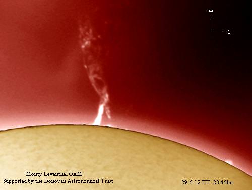 This unusual prominence on the Sun looks like an exhaust-spewing smokestack. It was captured by noted Australian amateur astronomer Monty Leventhal on May 29, 2012. He used a Canon 600D camera with a Hydrogen-alpha filter and a Meade S.C. 10 inch telescope.